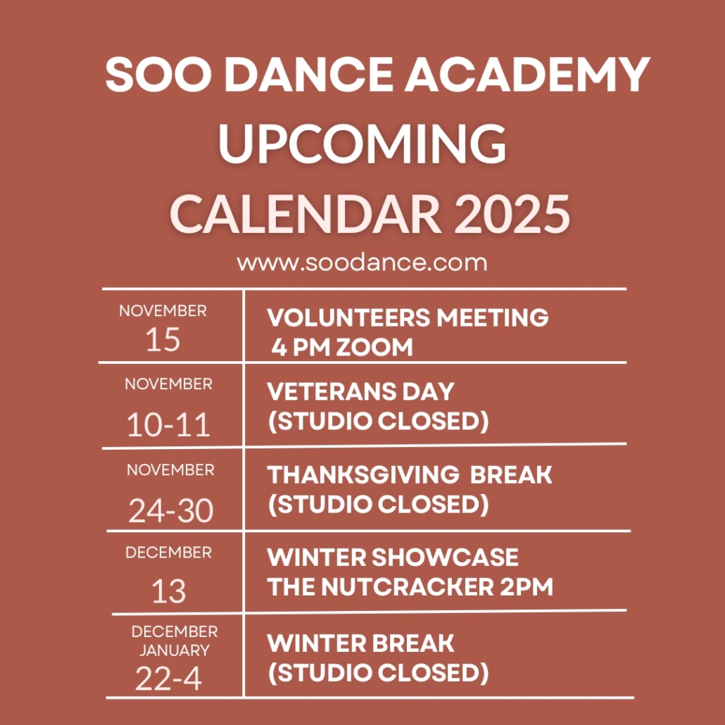 Blackhawk studio and San Ramon studio will be open to recreational students (ages 2.5-18) – Students who join 2 classes per week are eligible for our annual recital! Soo Dance Company & Academy puts on 2 performances per year: the Spring and Winter Show.